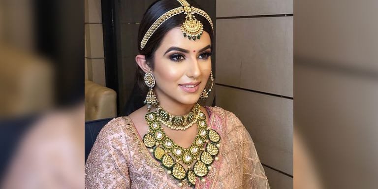Your bridal makeup look should always complement the attire you are wearing, your aura, and what you like it to be. For royal-colored outfits like red, hot pink, and maroon, go for the matte base with bold lips. If your attire belongs to the light shade family, then you can go for a dewy skin base, shimmery eyes, and glossy lips.